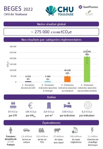 Après 3 premiers BEGES réalisés en 2012, 2015 et 2019, retrouvez ci-dessous le dernier bilan des émissions de gaz à effet de serre synthétique publié par notre établissement en 2022 :