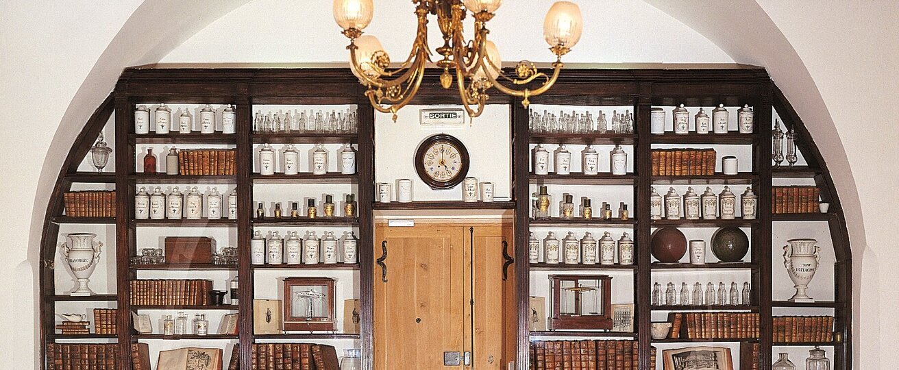 La salle I au rez-de-chaussée est l’ancienne Pharmacie avec ses boiseries du XIXe siècle : mortiers, balances, collections de pots, ouvrages et livres anciens, peintures, restituent l’atmosphère et l’activité de l’époque.